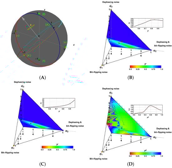 Thus, as before, optimizing the function at each point in the Pauli channel parametric space for the appropriate values of (as before, depends on , and was initially fixed at ), the optimal results are shown in Figure 6C in color, similarly to . A slight improvement was observed for several channels. The upper inset shows the distribution of values in the parametric space with and (see Table 2 for comparison).