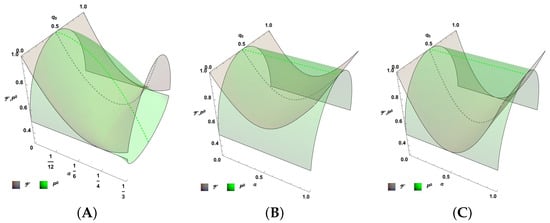 There are two distinct situations for the syndromic cases mixed with the transparent channel. Because the syndrome for affects the states in both bases considered, the scenarios , exhibit a different behavior compared to those with , , where , or , . In addition to these distinct scenarios, we consider a third case: the central line of the parametric space, , for , which first ranges from the transparent channel towards the depolarizing channel, and then to the ICO channel. These three scenarios are depicted in Figure 7, showing (grey surface) as a function of the parameters and defined above for each scenario. Similarly, the green surface represents . In all three scenarios, the special solution for is highlighted for and , as it provides the optimal solution for the average fidelity.