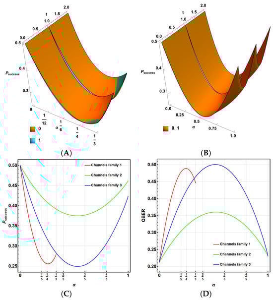 It should be clear that the improvement compared to the tracing scheme was because measuring introduced a filter on the average procedure (represented by the tracing). However, because these latter schemes are stochastic, an additional analysis should be performed for the values of . These values determine their feasibility. Since ICO + 3-QC is an improved error correction code of ICO, both are optimally achieved under the same parameters . Thus, the values for the optimal have a statistical distribution throughout the parametric space of the Pauli channel, with and . These values are represented in color in this parametric space in Figure 6D, and the upper inset shows the statistical distribution. The values are high enough to produce an improved communication procedure using the ICO architecture, as shown by the mean and the inset with a distribution peak around . Despite this, note that exhibits a lower success probability than . Despite its fidelity, it requires repeating the procedure several times before a measurement success. This makes this procedure only selective for certain channels with higher (blue zones in Figure 6D). Nevertheless, in such a -map with high variability, the zones with include the channels near to the different pure syndromes where also . In particular, the channels near the pure syndromes exhibit not only a higher geometric average for fidelity but also a higher success probability. We analyze these particular but relevant cases in the next subsection.