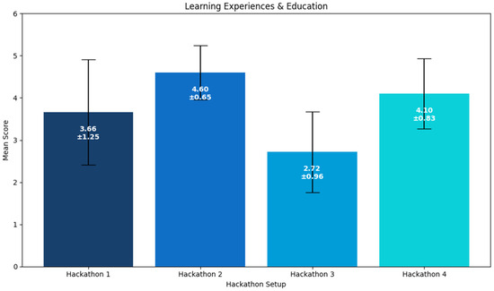 The results for the Learning Experiences and Education category (Figure 1) show that the Cartagena hackathon received the highest average rating of 4.60 (SD = 0.65). DigiEduHack followed with a score of 4.10 (SD = 0.83), suggesting a similarly positive learning experience. The Chania hackathon, with a score of 3.66 (SD = 1.25), reflects moderate learning experiences. Porto Alegre received the lowest score of 2.72 (SD = 0.96), suggesting that opportunities to strengthen the learning components of that event should have been considered. The questions related to the participants’ learning outcomes, which provide insights into how participants assessed the educational value and applicability of the hackathon activities to their academic training, can be found in Appendix A (Table A1). Except for Cartagena, all hackathons showed relatively high variability in responses, indicating diverse experiences.