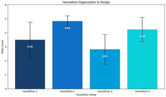 Figure 3 presents the average scores for Hackathon Organization and Design across the four events. Cartagena led with a score of 4.82 (SD = 0.38), indicating exceptionally high satisfaction with the overall experience and event structure. DigiEduHack followed closely with a strong average score of 4.23 (SD = 0.86), reflecting well-organized mentorship and clear judging criteria. Chania received a moderate score of 3.50 (SD = 1.26), while Porto Alegre had the lowest average at 2.81 (SD = 1.06), suggesting synchronous hybrid events are more challenging both for organizers and participants. The results highlight how organizational design impacted participant satisfaction across the different hackathon setups. Questions evaluating the structure and organization of the hackathons, including clarity of objectives, judging criteria, mentorship, and overall event format, are presented in Appendix A (Table A3). The low standard deviation in Cartagena indicates a strong agreement among participants that the organization was effective, while higher deviations in other hackathons reflect more varied experiences and perceptions of the event structure.