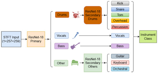 Our system, presented in Figure 1, employs a hierarchical classification approach using specialized ResNet models at different levels. This architecture provides both broad categorization and fine-grained instrument identification. More specifically, we divide this into Primary and Secondary classification problems. Inspired from the Music Source Separation [36] task, we found it helpful to first classify the audio in four main classes: Vocals, Bass, Drums, and Other (anything else). The second step consists in subclass identification. For Bass and Vocals, the Primary classification already provides sufficient specificity, as these categories typically represent distinct instruments that do not require further differentiation in the mixing context. Furthermore, separating Vocals in Backing or Leading Vocals, or Bass into multiple subclasses, directly from audio, can be quite difficult. Therefore, we focused our Secondary classification efforts only on the more diverse Drums and Other categories by applying specialized models trained for each subcategory. We divided drum sounds into five distinct classes: Kick, Snare, Tom, Overhead, and Percussion. Similarly, the Other category was further classified into more specific instrument families: Guitar (electric and acoustic), Keyboard (piano, synthesizers), and Orchestral (strings, brass, woodwinds).