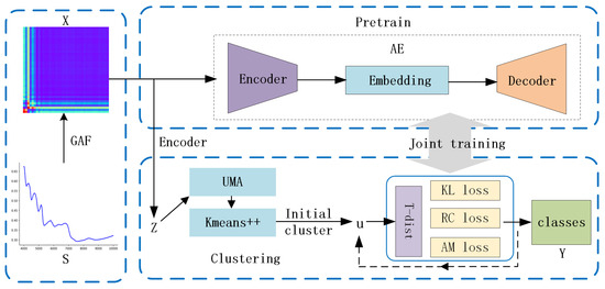 In summary, VAE clustering may result in an over-smoothing latent space, causing cluster boundaries to become blurred. When the model structure and parameter selection are inappropriate, convolutional autoencoders (CAE) can lead to inadequate feature representation or overfitting. In this paper, considering that deep embedded clustering has advantages in automatic feature extraction and identifying unknown classes and robustness, we replace the feedforward neural network autoencoder with a CAE to more effectively capture local features in GAF images and remove noise and redundant data. The uniform manifold approximation is introduced into the clustering module to improve the quality and distribution of the clustering centers. The adaptive boundary loss function is introduced into the loss function to reduce the ambiguity on the clustering boundary, increase the degree of separation between classes, and improve the generalization ability of clustering.