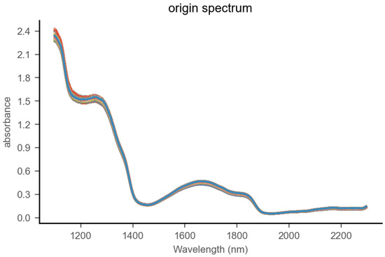 We purchased regular milk and lactose-free milk of the same brand but from different batches from the supermarket. The lactose content of the regular milk was found to be approximately 4.6%. We selected 25 samples of regular milk and 25 samples of lactose-free milk, with each sample being 200 milliliters. Using lactose-free milk as a base, we blended in regular milk at mass percentages of 0%, 12.5%, 25%, 37.5%, 50%, 62.5%, 75%, 87.5%, and 100%, where 100% means the sample contains only regular milk. The 25 samples were thoroughly mixed at different concentration gradients to produce 225 adulterated samples. Each sample was divided into 10 portions for testing, resulting in a total of 2250 adulterated samples. The samples were placed in 2-milliliter sample cups and stored at 40 ± 0.1 °C constant temperature. A 2 mm liquid optical fiber probe was adopted. The spectral range spanned from 1100 to 2300 nanometers with 2-nanometer intervals. Each sample underwent 20 scans, and the average was calculated. The spectral graph of milk samples is shown in Figure 3.