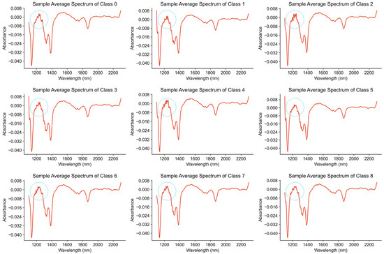 In this experiment, the adulterated milk samples are divided into nine classes, represented as class 0, class 1, through to class 8. The specific meanings are described in Section 4.1. We calculated the average of the spectra for the samples in each class to obtain the average spectrum for that class. As shown in Figure 4, in the range from 1200 to 1400 nanometers, the subtle characteristic differences in the absorption peaks of the nine types of milk spectra are highlighted. However, the absorption peaks of the spectra in other wavelength intervals are still very similar, and more effective feature extraction methods are needed to increase the discrimination of different classes.
