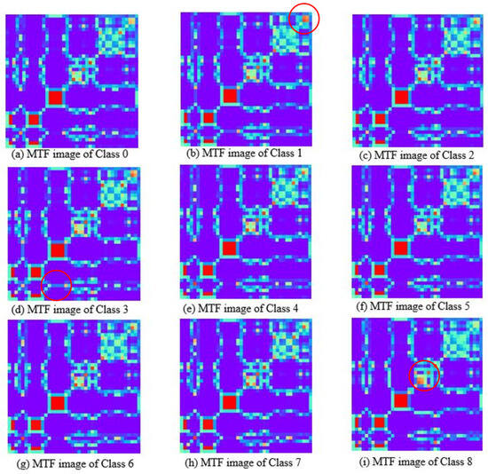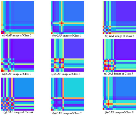 The milk spectra were transformed into two-dimensional color images using the GAF and MTF method. Figure 5 illustrates the feature images of nine types of milk samples generated through GAF. There are significant differences in the characteristics between them. GAF captures changes in time series through angle coding, it can better retain some characteristics corresponding to lactose in the original spectrum. The lower left corner of the image reflects the correlation of absorbance changes in the initial part of the spectral sequence. Classes 0, 1, and 7 exhibit small changes in this segment, while classes 4, 5, and 6 display substantial variations. The change of cross-texture indicates the difference of absorbance amplitude across different wavelength points. There are many red blocks in the GAF plots of classes 4 and 5, indicating that the corresponding lactose bands of these classes have strong correlation characteristics. There are more cross textures in classes 1, 2, 4, and 8, which correspond to the positions of the characteristic peaks in the spectrum, highlighting the important features in the original data. The absorption peaks of classes 0, 2, and 3 appear earliest, while classes 4, 6, and 7 show the latest absorption peaks.