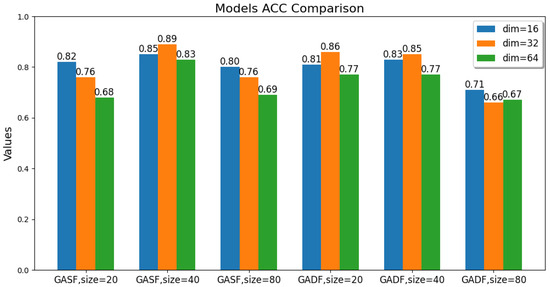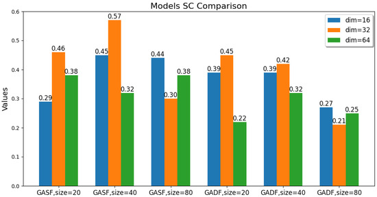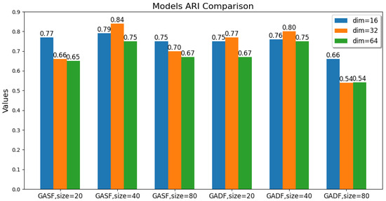 The values of these parameters, including the GAF transformation method, image size, and latent feature dimension, are changed. The ACC, ARI, and SC metric values of the GAF-ConvDuc clustering model are recorded, as shown in Figure 7, Figure 8 and Figure 9. The model performs best when the parameter combination is GASF, size = 40, and dim = 32. The clustering accuracy is 0.89, and the adjusted Rand index is 0.84, indicating a high consistency between the clustering results and the true class labels. The silhouette coefficient improves from 0.29 to 0.57, signifying a significant improvement in clustering quality, with increased intra-cluster tightness and inter-cluster separation and relatively clear boundaries.