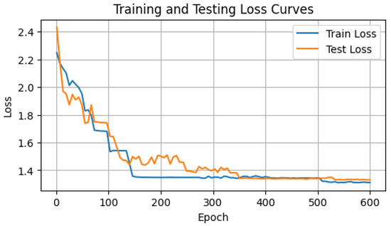 During the training of the GAF-ConvDuc model, the network parameters and clustering centers are iteratively optimized, with the goal of minimizing the loss function and the intra-cluster distance. To prevent the model from overfitting or underfitting, it was trained for 600 epochs, and the training and validation set loss were recorded, as shown in Figure 10. Model training adopts a learning rate of = 0.001, embedding a feature dimension of dim = 32, utilizing the Adam optimizer.