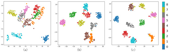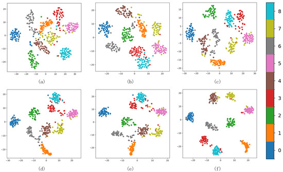 As shown in Figure 11 from (a) to (f), it can be seen that, initially, the boundaries between the nine clusters are seriously confused. As the number of iterative optimization steps increases, the distances between different types of milk samples are also increasing. With continuous optimization, ambiguous boundary points in Figure 11c progressively migrate towards the true class centers, intra-cluster data distributions become markedly denser. In Figure 11f, only a few samples are confused. It demonstrates that integrating uniform manifold approximation with K-means++ clustering enhances the initial clustering centers. During the joint clustering optimization, the incorporation of an adaptive margin loss sharpens the boundaries between classes, thereby improving both inter-cluster separation and intra-cluster cohesion.
