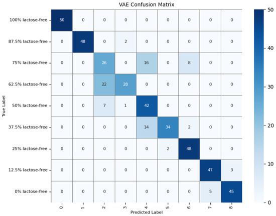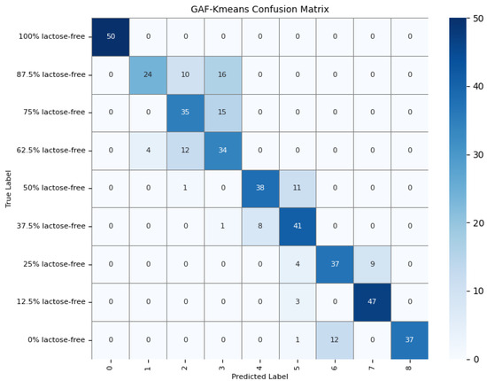To further understand the model’s detection accuracy on different types of milk samples, 450 randomly selected test samples were predicted using the GAF-Kmeans, VAE, and GAF-ConvDuc models, respectively. The confusion matrices are shown in Figure 13, Figure 14 and Figure 15.