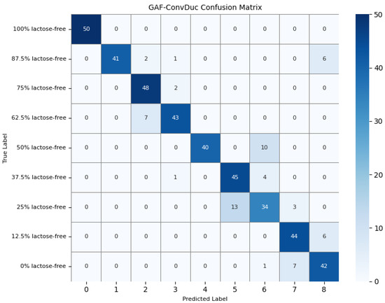 The results indicate that 100% lactose-free milk samples can be correctly identified by all three models. The total number of misclassified samples for the GAF-Kmeans, VAE, and GAF-ConvDuc models are 95, 71, and 63, respectively. GAF-ConvDuc model performs the best. GAF-Kmeans model has an average precision of 0.786, a recall of 0.762, and an F1-score of 0.764. The VAE model has an average precision of 0.841, a recall of 0.818, and an F1-score of 0.819. The GAF-ConvDuc model has an average precision of 0.879, a recall of 0.86, and an F1-score of 0.871. The proposed model achieves the highest recall, reducing the rate of missed detections of adulterated samples.