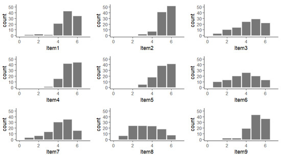 In the first step, data was analyzed descriptively (Table 2, Figure 2). The relationship between the items was visualized by means of a Kendall correlation matrix (Figure 3). The inter-item correlations varied between weak (r = −0.07) and strong (r = 0.65), indicated by the size and color of the dots. The non-parametric MSA showed a scalability coefficient Hij between −0.15 (negative relationship) and 0.9 (positive relationship) for each item pair. For each individual item, the coefficient Hj ranged between 0.18 and 0.39. The test scalability coefficient with H = 0.32 was considered weak [20]. In addition, the AISP indicates a two-factor solution for the chosen cutoff value of c = 0.3, with one scale comprising items 1, 2, 4, 5, 7, and 9 and another one comprising items 3, 6, and 8. Therefore, the results of the MSA did not meet the requirements of a monotone homogeneity model, i.e., unidimensionality could not be assumed. McDonald’s Omega can be considered good at = 0.81. The subsequent CFA revealed that a single-factor model is not a suitable fit for the present Chinese data (CFI = 0.672, TLI = 0.562, RMSEA = 0.200, SRMR = 0.144) with item 3 showing a non-significant loading on the factor. In summary both, the results of the MSA and the CFA argue against the unidimensionality of the ATI scale for the Chinese data.