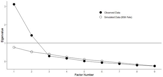 Therefore, in a next step, we conducted an EFA to determine the underlying factor structure exploratively. Bartlett’s test of sphericity was significant, (36) = 353.2, p < 0.001, and the Kaiser–Meyer–Olkin measure of sampling adequacy indicated strong relationships among variables (KMO = 0.76). Thus, the factor analytic model analysis could be proceeded. Regarding the number of extracted factors, the Kaiser–Guttman criterion, the Scree Test and the parallel analysis indicated the extraction of two factors (see Figure 4). An EFA with Promax rotation was conducted since we expected the factors to be correlated (RMSEA = 0.097, TLI = 0.889). The underlying factor structure is visualized in Figure 3. The two-factor solution yielded a total variance explained of , with Factor 1 explaining and Factor 2 explaining 20% of variance. When descriptively compared to the fit indices of the one-factor solution, the subsequent CFA indicated that a two-factor model provides a mostly acceptable and more suitable fit for the data (CFI = 0.926, TLI = 0.898, RMSEA = 0.096, SRMR = 0.078). The internal consistency of the two-factor model was considered good for Factor 1 at = 0.84 and acceptable for Factor 2 at = 0.79. Finally, the single-factor and the two-factor models were compared by means of fit indices and an ANOVA. The comparison between both models showed that the two-factor model fits the data significantly better than the single-factor model: (1) = 86.3, p < 0.001 (AICsingle factor = 2457, AICtwo factor = 2373, BICsingle factor = 2504, BICtwo factor = 2423).