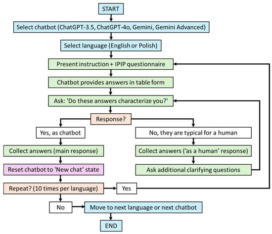 Flowchart showing the procedure of collecting data from chatbots. IPIP—International Personality Item Pool [22,23].