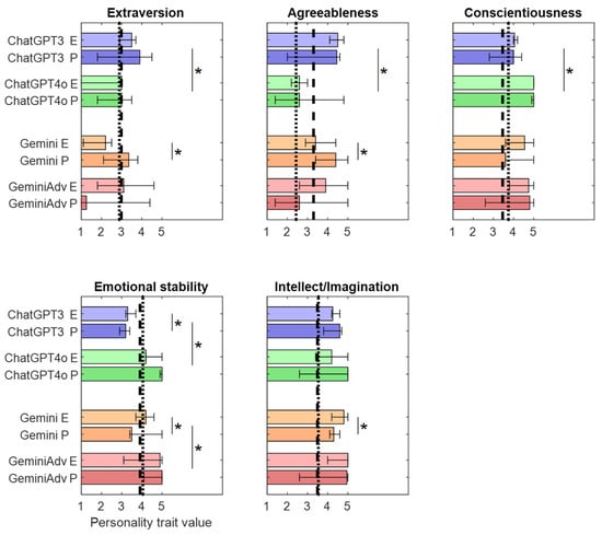 The rapid advancement of artificial intelligence (AI) has brought about a significant transformation in human–computer interactions [1,2]. A great step forward has been the development of large language models (LLMs) and chatbots based on them [3,4]. These sophisticated AI systems are designed to understand and generate human-like texts, enabling them to engage in complex and often nuanced conversations. These AI systems are on the verge of being a core part of various fields of activity, from customer service [5] to medical or psychological support [6,7], so gaining insights into the personality traits they present to the world is important.