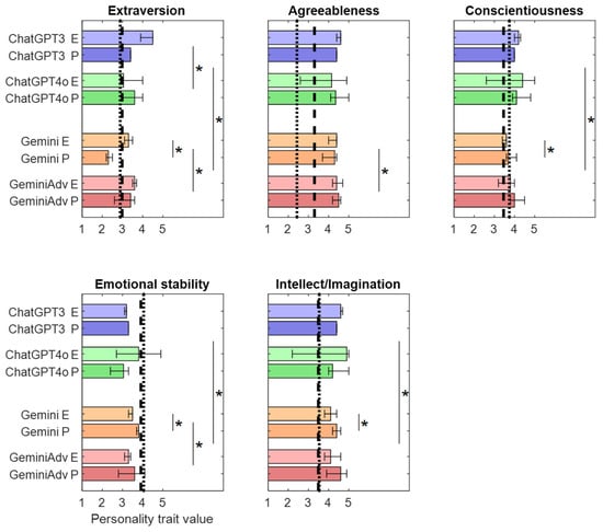 Big Five personality traits of different chatbots. Median values are shown with the minimum and maximum values (whiskers). Results for two versions of ChatGPT (3.5 and 4o) and Gemini (Standard and Advanced) are shown. Responses in two languages are shown (E, English; P, Polish). Dotted lines represent results for English-speaking people ([26], Table 3); dashed lines represent results from Polish-speaking people ([13], Table 3). Asterisks mark significant differences for pairwise comparisons.