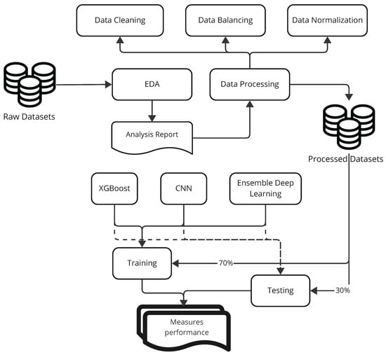 This section discusses the data used and the application of machine learning and deep learning models to perform the classification task (see Figure 1). The applied methodologies included excellent machine learning techniques and advanced deep learning architectures to provide a comprehensive evaluation and comparison of the models used. The models used in this study include XGBoost, a deep learning model with convolutional layers, and an ensemble model that combines deep learning approaches.