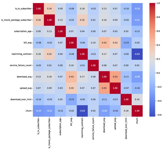 We conducted an exploratory data analysis (EDA) to investigate feature distributions, class imbalances, and relationships with the target variable. Table 1 presents the class distribution percentages before resampling, highlighting significant imbalances in Insurance (11.70% churn) and Telecom (14.49% churn), while ISP is relatively balanced (40.36% churn). Post-resampling, all datasets achieved a 50% churn rate. The exploratory data analysis revealed key insights into feature distributions and relationships with churn. For the Insurance dataset (33,908 records pre-resampling), numeric features (e.g., feature_0 to feature_15) exhibited skewness, with feature_3 showing a strong influence on churn prediction. In the ISP dataset (3333 records preresampling), subscription_age and bill_avg displayed positive skewness, with bill_avg values significantly higher among churners (mean bill_avg for churners: $120.50 vs. $85.30 for nonchurners). The Telecom dataset (72,274 records preresampling) showed skewness in total_day_minutes and total_day_charges, with churners averaging 230.4 min daily compared to 180.2 for nonchurners. Outliers were identified in ISP bill_avg (e.g., values exceeding $200) and Telecom customer_service_calls (e.g., five calls), indicating higher churn likelihood. Categorical feature analysis showed that in ISP, 65% of monthly contract holders churned compared to 20% of yearly contract holders, while in Telecom, 45% of international_plan subscribers churned vs. 10% without the plan. In Insurance, payment methods (e.g., electronic check) were associated with a 30% higher churn rate than bank transfers. Figure 2, Figure 3 and Figure 4 illustrate correlation matrices, highlighting key predictive features, such as feature_3 (Insurance), remaining_contract (ISP, 0.62), and international_plan (Telecom, 0.283). These insights guided feature selection and model development.