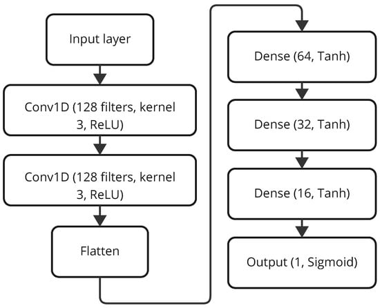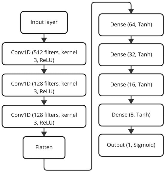 On the other hand, the LFE-CNN, whose architecture is shown a streamlined for faster computation while retaining almost full feature extraction ability. The design consists of two Conv1D layers with 128 filters each, a kernel size of 3, and ReLU activation, followed by a Flatten layer. Then come three Dense layers of 64, 32, and 16 units with Tanh activation, respectively, finished with a Dense layer with 1 unit and sigmoid activation for binary classification. By having fewer convolutional layers than the DFE-CNN, it gains the advantage of faster training and inference in cases where real-time prediction or very limited computation is demanded, yet having productive feature extraction remains possible.