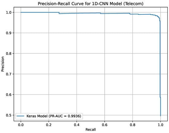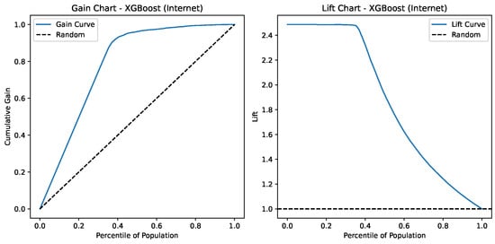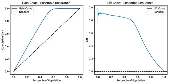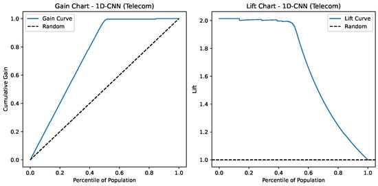 The inclusion of Precision-Recall AUC (PR-AUC) and cost-based metrics enhances the evaluation, particularly for imbalanced datasets where churners are the minority class. The Ensemble Deep Learning model achieved a PR-AUC of 93.54% on the Insurance dataset, XGBoost achieved 97.89% on the ISP dataset, and 1D-CNN achieved 99.36% on the Telecom dataset, indicating a strong performance in identifying churners (Table 1). Cost-based metrics (Table 6) show that the Ensemble model maximizes net benefit on the Insurance dataset (USD 2,721,200), followed by XGBoost on the ISP dataset (USD 1,819,450) and 1D-CNN on the Telecom dataset (USD 280,550). Precision-Recall curves and Lift and Gain charts (Figure 14, Figure 15, Figure 16, Figure 17, Figure 18 and Figure 19) further demonstrate the models’ ability to prioritize high-risk churners. For instance, the Ensemble model on the Insurance dataset achieves a lift of 1.9× in the top decile, XGBoost on the ISP dataset achieves 2.5×, and 1D-CNN on the Telecom dataset achieves 2.0×, highlighting their practical utility for targeted retention strategies and alignment with business objectives.
