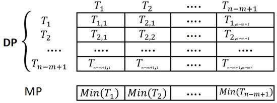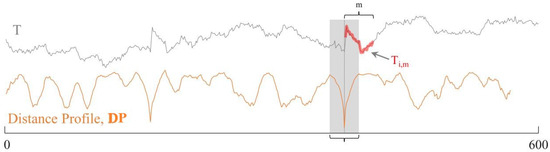 “All-subsequences” can be defined as a set of subsequences derived from a time series that encompasses all possible combinations. This “all-subsequences” concept is primarily used for notation. The implementation refrains from extracting all subsequences because of its exponential time complexity and potential memory constraints. Figure 3 illustrates the distance profile of the time series T with a subsequence .