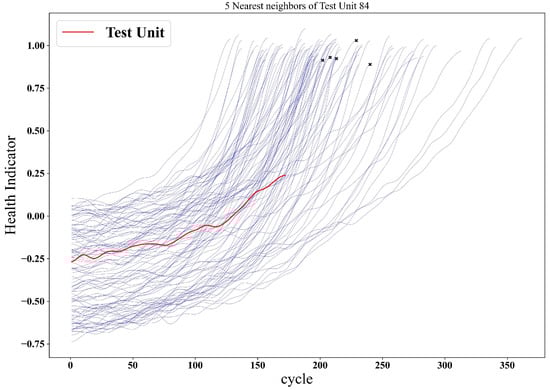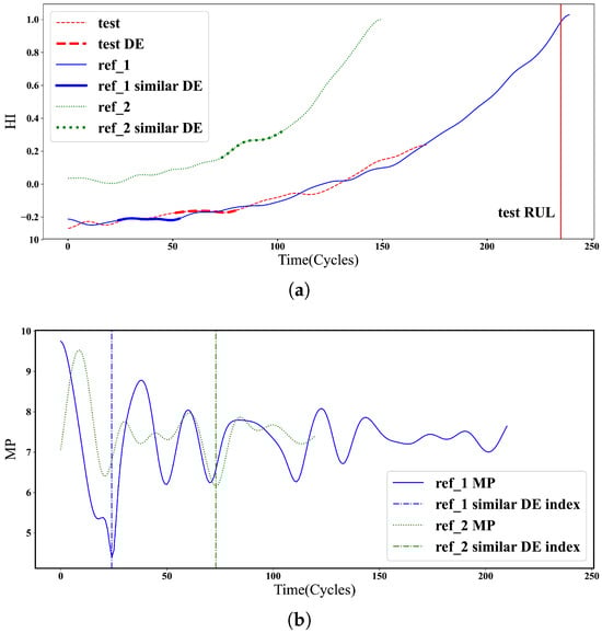 Unlike in the traditional distance profile in Section 3.2.1 and the matrix profile in Section 3.2.2, we are interested in finding reference systems with the most similar DE to the test system. As shown in Figure 6a, the lowest distance of the matrix profile represents the most similar subsequence to the test DE of the test system with an extracted DE, which is considered alongside two reference systems exhibiting subsequences resembling the test DE in Figure 6b. The reference system displaying the closest resemblance to the DE of the test system is chosen to estimate the RUL of the test system. Specifically, manifests a subsequence more similar to the test DE than .