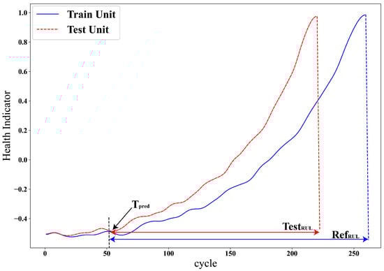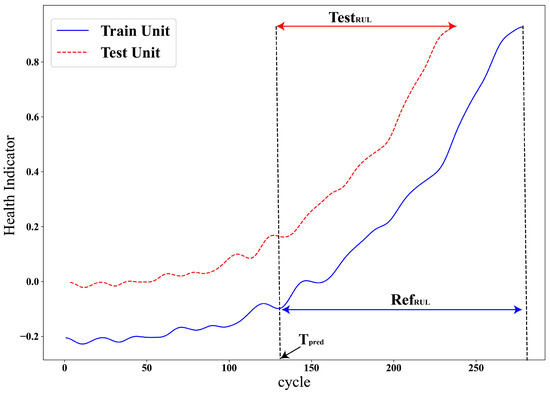 The initial wear of the system is usually ignored in almost all similarity-based approaches. The selected RULs of the reference systems may not be directly applicable if their initial wear differs from the test system’s, as shown in Figure 7. A similar system has different initial wear, ending with a different RUL. The selected most similar reference and test systems may have the same degradation history but different initial wear. This difference also affects the RUL; for instance, a system with healthy initial wear tends to have a longer RUL, whereas a system with deteriorated initial wear usually has a shorter RUL. Therefore, adjusting the reference system’s RUL before estimating the test system’s RUL based on the initial conditions is more appropriate.