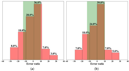 The relative frequency distribution of RUL prediction error ratios for FD001 (a) and FD003 (b).
