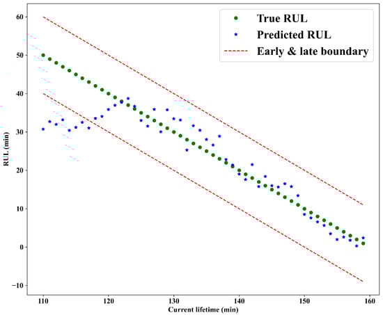 Here, and are two scaling variables. is applied to increase the reference RUL, whereas decreases the reference RUL. A large value of the scaling variable results in a greater degree of change, whereas a small value results in a smaller degree. Therefore, this variable must be selected carefully; otherwise, under- or over-adjustment may occur. The evaluation of the selections of and is presented in Section 4. Later predictions are much worse than early predictions [2]. Thus, is preferred to be relatively small in most applications.