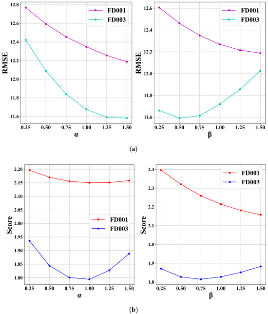 To assess the sensitivity of the proposed method to the adjustment parameters and used in the reference RUL adjustment process, we conducted a grid search over a predefined range of values: {[0.25, 0.5, 0.75, 1.0, 1.25, 1.5]}. The evaluation was performed on FD001 and FD003 datasets using score and RMSE as performance metrics.