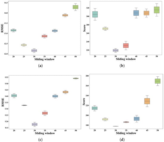 Effect of sliding window size on RMSE (a), and Score (b) using FD001, and RMSE (c) and score (d) using FD003.