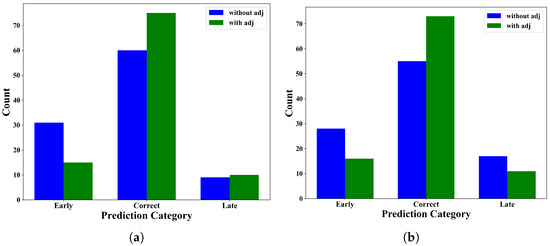 Comparison of prediction categories With and without adjustment for FD001 (a) and FD003 (b).