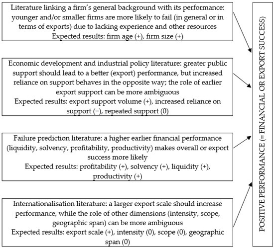 The paper is structured in a classical way. First, the theoretical background of different variables in predicting (non-)success after export grant provision is outlined. Then, the study design’s part focuses on the dataset and methods implemented. Thereafter, the main results—including theoretical and practical discussion—are presented, and the paper is finalised with a conclusion part including the study’s limitations and future research directions.