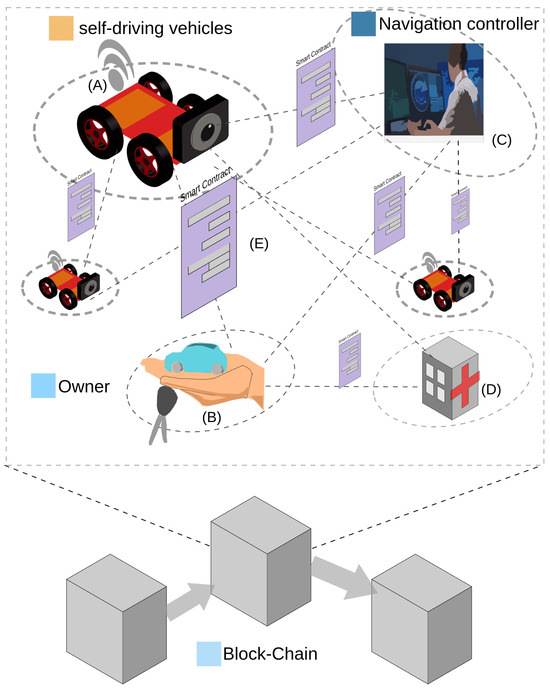 Autonomous navigation scenario in a decentralized network. (A) the autonomous vehicle, (B) the owner, (C) the navigation authority, (D) a public entity, and (E) the transaction smart contract.