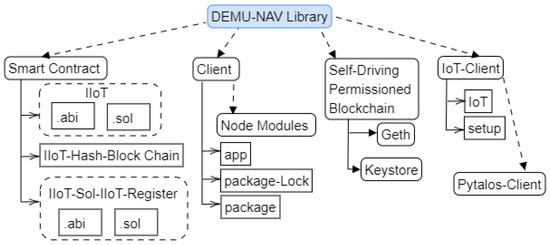 To understand the interaction between different actors such as authority navigation, autonomous vehicles, humans, and Blockchain, it is necessary to have a framework that lets us see and manipulate the interaction through them. The software structure of the DEMU-NAV library is shown in Figure 4. The library consists of five packages: