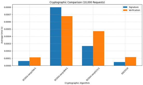 Figure 5 shows a comparison of cryptographic performance for signature generation and verification. The results show that algorithms A and D perform the best, as they present an optimal balance in terms of signature generation and verification. This makes them ideal candidates for use in our implementation and they match the elements described in Section 3.3.3.