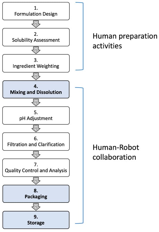 The steps of galenic solution preparation: From Step 4 to Step 9, human–robot collaboration can be put in place.