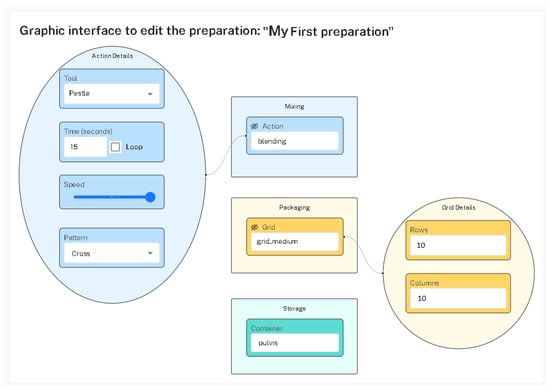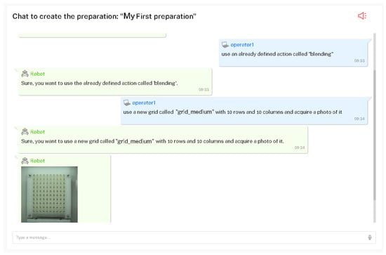The developed prototype is a web-based application featuring a client–server architecture. Its most important pages are devoted to the definition of a galenic preparation. These pages consist of a chat interface (Figure 2) and a domain-oriented graphic interface (Figure 3). Using these interfaces, the pharmacist can generate a JavaScript object notation (JSON) representation of a robot task concerning a galenic preparation and eventually create a robot program.