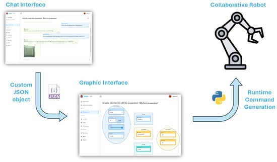 Once the preparation has been defined, either via the chat or the graphic interface, it is stored in the database as a JSON object. This JSON object is a high-level specification of a robot task that needs to be instantiated by selecting at runtime the elementary actions, adapted to the specific characteristics of the robot in use. This is accomplished by a Python program that interprets the JSON object and generates at runtime the corresponding commands for the robot, such as moving to a specific position or searching for an object in the working area. Figure 4 shows the operational process chart for the definition and execution of a robot task.