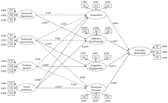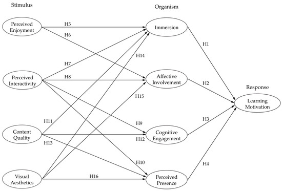 Based on this theoretical foundation, this study conceptualizes learning motivation as the response variable. The organism layer includes four internal psychological states: immersion, affective involvement, cognitive engagement, and perceived presence. Perceived enjoyment, perceived interactivity, content quality, and visual aesthetics as stimulus variables (see Figure 1 for the hypothesis model).