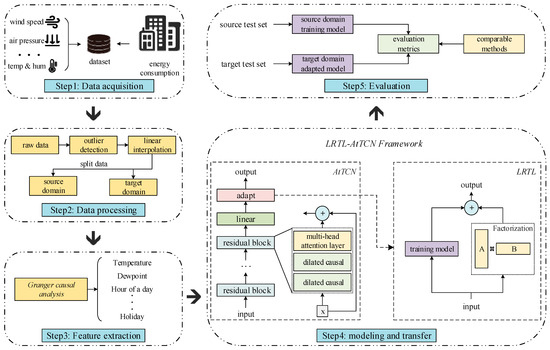 The overall framework of method in this paper is shown in Figure 1. It includes the following five steps: (1) Step 1: data acquisition. Energy consumption data in this paper were collected from several office buildings in Shanghai, China, and the weather data were collected from a weather station located within 5 km of the office. (2) Step 2: data processing. Statistical methods are employed to identify and process outliers in energy consumption data, thereby ensuring the accuracy and completeness of the dataset. Furthermore, the pertinent data are normalized to eliminate discrepancies between different scales and enhance the efficacy of model training. (3) Step 3: feature extraction. The data features were selected utilizing Granger causality analysis, which examines the causal relationship between external features and energy consumption. This method was employed to identify the key features that exert a substantial influence on energy consumption prediction. (4) Step 4: modeling and transfer. We utilize AtTCN for training of the source building domain and save the optimal model. Subsequently, we employ LRTL to transfer the trained model to the small-scale dataset on the target building domain, which enables the transfer of knowledge from the source building domain to the target building domain. (5) Step 5: evaluation: A comparative analysis is conducted between the source building domain and the target domain against other methods, with further performance evaluation of LRTL-AtTCN in Experiments and analysis.