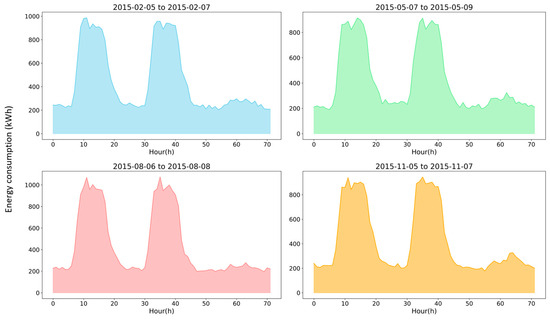 This study investigates a representative energy consumption curve from the dataset, aiming to uncover characteristic consumption patterns and temporal dynamics. Figure 2 presents four subplots, each depicting the load curves from Thursday to Saturday across different seasons, where the horizontal axis in each subplot represents the time axis, while the vertical axis corresponds to energy consumption data. These subplots illustrate the seasonal variations in energy consumption, which demonstrate that energy consumption patterns remain unaffected by seasonal factors.