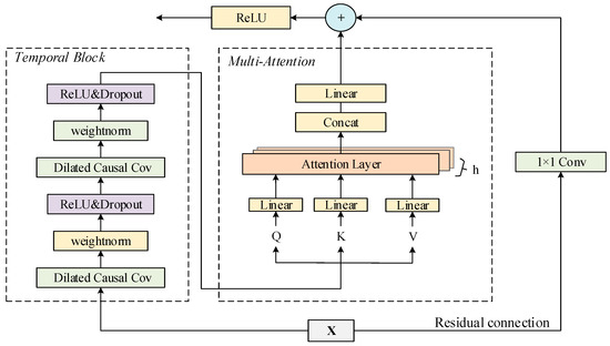 The extracted local hidden features, designated as , are subjected to a linear transformation to generate , whose vectors are subsequently computed by MHA. In conjunction with the residual connection structure, the final output, . AtTCN is computed as follows: