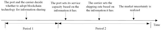 25] investigated from the perspective of investment in forecasting information channels. They built a three-tier maritime supply chain model based on the assumption that demand interruptions are a primary cause of asymmetric information. Their study explored the impacts of stochastic demand disruptions and channel competition, suggesting that the decision to invest in predictive information channels depended on the chain members’ attitudes towards interruption risks. In contrast, we examine a maritime supply chain consisting of a port and a carrier, where both the port and the carrier can forecast information related to market demand uncertainty. Our focus is on the incentives for both parties to adopt blockchain technology to share information, particularly in the context of demand mismatches.
