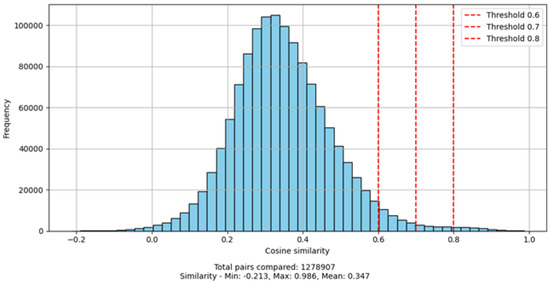 Following an in-depth analysis of the similarity matrix, we set the threshold at 0.7, as this value effectively distinguishes significant relationships between tokens from weaker or irrelevant ones. Hence, the goal is to select the strongest semantic relationships, avoiding weak or redundant connections. As shown in the distribution of similarity scores in Figure 2, most cosine values fall between and . Based on this observation, we set a threshold at to retain only pairs with high semantic affinity. This threshold integrates seamlessly with the graph reconstruction step, where only the above-threshold tokens (i.e., terminal nodes) are connected, including the minimum set of intermediate nodes necessary to ensure overall connectivity. This step is crucial—as discussed in Section 3.3—for enabling the proper conversion of the graph into the Penman format. As a result, the final graph is structured around strong semantic links, thus supporting genuine evidence reduction rather than mere paraphrasing. Token/node selection is currently based solely on semantic similarity—a limitation we plan to overcome by introducing syntactic validation via part-of-speech (POS) tagging.