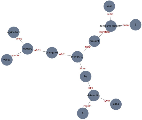 The ClimateBERT_factcheck dataset underwent a cleaning process that removes any inconsistencies or irrelevant data. Once the cleaning phase was completed, the relevant data, namely claim and evidence, were converted into AMR graphs using the SPRING tool, integrated via RESTful API. AMR graphs explicitly represent the semantic meaning of sentences, capturing conceptual relationships and the context of the sentences. Figure 4 shows an example of an AMR graph for the sentence, “By August 2014 a three year drought was prompting changes to the agriculture industry in the valley”. In the figure, the nodes of the graph correspond to the tokens of the sentence, and the edges represent the semantic relationships between concepts.