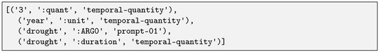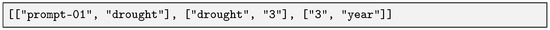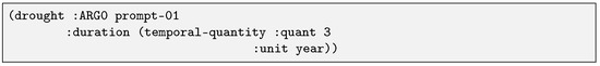 Finally, extracted sub-graphs are converted into the Penman representation using the Eponymous library, which interprets the sub-graph nodes as concepts and the edges as relationships, thereby creating a readable structured representation. In the case of our example, the conversion failed due to a semantic ambiguity that generated a layout error. As shown in Figure 7, it is evident that some triples—namely, source node, relation, and target node—are poorly structured and do not properly explain the relationships between concepts. In our case, the concept temporal quantity is used three times as a target, leaving its nature ambiguous and the relationship between the concept drought and its temporal duration 3 years unclear.