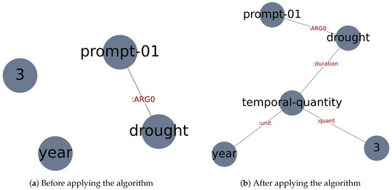 Once nodes are aligned, the creation and manipulation of the graph required to visualize and analyze the data can be carried out. Specifically, the AMR graph of the evidence is represented by means of the NetworkX library, through an undirected graph. The AMR node IDs, extracted via the AMR reader, are used as unique identifiers for the graph nodes. The tokens extracted from the sentences, which represent the significant concepts, are instead associated to the graph nodes as labels. This representation is crucial because it allows for the easy manipulation required for targeted analyses. In particular, it enables the extraction of the sub-graph of interest by applying the minimum Steiner tree algorithm already implemented in NetworkX. The algorithm uses the entire evidence graph and the list of selected AMR concepts to return a subset of nodes and edges that constitute the minimum Steiner tree. The latter connects a specific set of nodes (the terminals) of a weighted graph. The goal is to minimize the total cost of the tree that connects these terminal nodes, allowing the inclusion of non-terminal nodes that are necessary to optimize the connection. An example of such a process is illustrated in Figure 6a. The figure illustrates the evidence before the application of the minimum Steiner tree algorithm. The nodes prompt-01 and drought are connected by the relation :ARG0, while the nodes 3 and year are orphan nodes.
