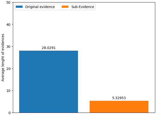 Hence, the average length of the original evidence statements of the dataset was calculated and compared with that of the evidence statements produced by EVOCA: as shown in Figure 9, there is a significant difference—approximately 80%.