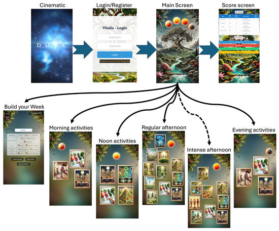 Following an analysis of technical feasibility, the educational mini-games in Vitalia were grouped into two core strands: physical exercise and nutrition. The daily low-to-moderate-intensity exercise program includes stretching, core movement, jumping and skipping rope, upper body and head movement, lower limb movement through walking, and upper limb activity with hands. Complementing these are high-intensity workouts, scheduled three times per week, featuring sit-ups, push-ups, planks, jumping jacks, and high-knee running. Nutritional learning is embedded through four playful activities: matching foods with nutrients, constructing the food pyramid, choosing appropriate meals for different times of day, and identifying singular foods in groups of four. In addition, the app provides the significant ability for children and their parents to build a weekly meal plan based on concepts and studies of nutritionists in the DUSE project. Figure 1 (Note: The English interface is shown in the presented figures for demonstration. The app already supports five languages and multilinguality in general.) shows an overview of the design, structure, and interaction flow of Vitalia.
